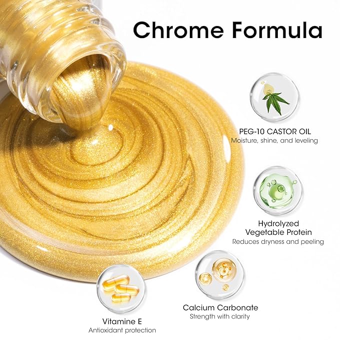 - Luxurious Chrome Nail Polish Set: This mini set includes 2 colors of intensely pigmented gold and silver metallic nail polish, 3-in-1 clear nail polish. The highly reflective metallic shades deliver a brilliant, liquid-metal chrome. Perfect for festive holiday looks, or adding a bold touch to your fingernail and toenail styles for any party or special event. It is a perfect gift for Halloween, Thanksgiving, Christmas, New Year's Eve, Valentine's Day or birthdays!