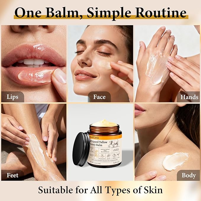 - Versatile Skincare: Use this tallow and honey balm as a tallow face moisturizer, under-eye cream, healing lip balm, body butter for elbows, knees, and hands. One jar of whipped tallow balm meets all your skincare needs