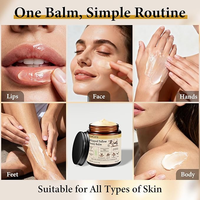 - Versatile Skincare: Use this tallow and honey balm as a tallow face moisturizer, under-eye cream, healing lip balm, body butter for elbows, knees, and hands. One jar whipped tallow balm meets all your skincare needs