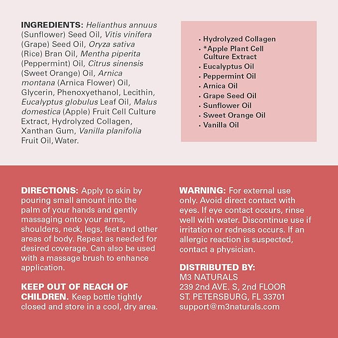 - Made to move with you: Whether you're just starting your wellness journey or deep into your routine, our body oil and massage roller are designed to work with your unique shape. The detachable, easy-grip tool adapts to any size for a comfortable, effective massage—especially when paired with our sore muscle Massage Oil, made in the USA with domestic and globally sourced ingredients. M3 Naturals is a brand that contains products that contain natural ingredients and other ingredients.