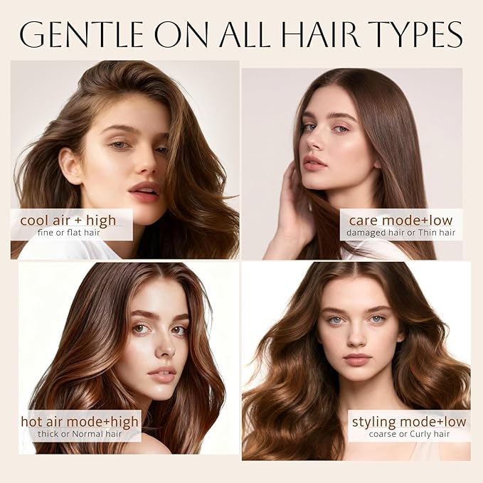 - 8 MODES, ONE-HAND ADJUSTABLE. 4 Heat settings (Cool/Care/Hot/Styling) & 2 Wind Speeds (Low: 30m/s, High: 50m/s) are within thumb reach for effortless one-hand control. Fit all hair texture, fine to coarse, whatever you have fine or normal or thick straight, wavy or curly hair. Fine hair: low heat & low wind speed. Thick or curly hair: High heat & power, there will always be a mode that suits you