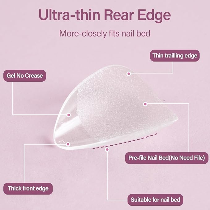 - 【Easy to Use】Our soft gel x nail tips have a more shallow curve, the thinner back edge can make the full nail tips fit your nails better, which will not make you feel uncomfortable. The thickened front edge makes it not easy to break or bend, having longer lifespan.