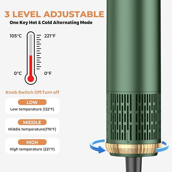 - โฐ Hair Dryer Drush Blow Dryer For All Hair - Blowdryers brush for hair supplies 3 temperature settings to adjust the heat. Magic styler is suitable for different hair types. High: quickly shape for thick & pre-dried hair. Middle: Suitable for long-lasting hairstyles you set. Low: Suitable for fine, soft, damaged & treated hair. The Hair brush blow dryer can effectively dry hair without damaging the hair, and it is flexible to set various hairstyles you want.
