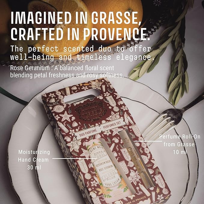 Panier des Sens - Geranium Rose Gift Duo Set - Hydrating Hand Cream 96% Natural Ingredients & RollโOn Eau de Toilette - Vegan & Made in France - Holiday Edition - Travel Size 1.7 Fl Oz + 0.3 Fl Oz