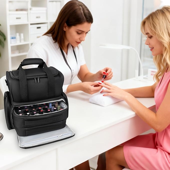 - Secure Dual-Layer Design with Removable Spong:The top compartment of this nail bag organizer case fits a lamp and cord. The bottom has two soft foam insert that securely holds 70 bottles, preventing collisions for safe travel.