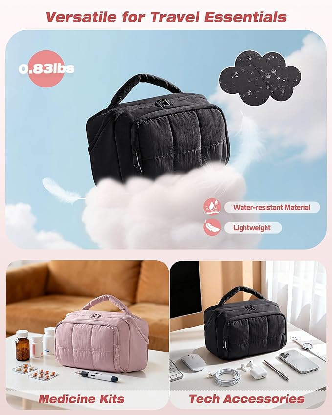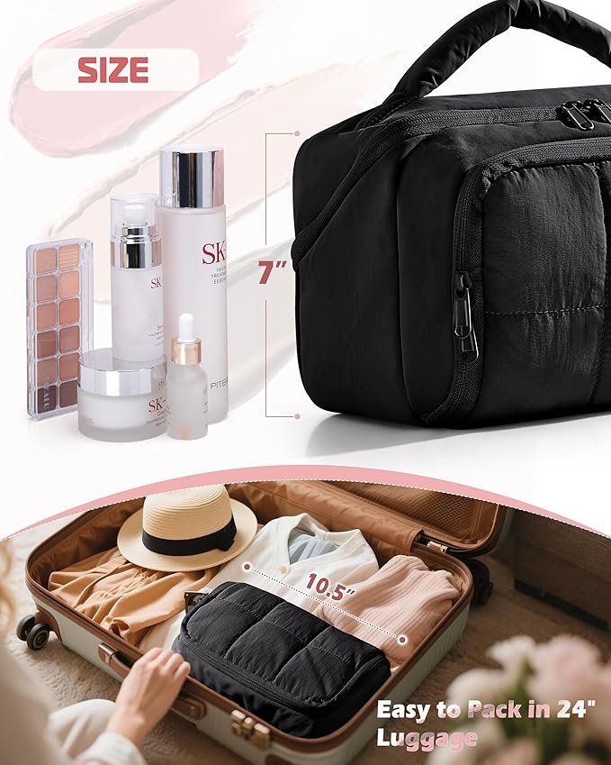 Travel Makeup Bag for Women, Toiletry Organizer with Waterproof Pockets, Puffy Cosmetics Pouch for Makeup Brushes, Skincare & Travel Essentials, Black (Bag only)