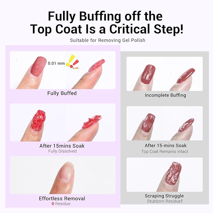 - To remove gel polish using acetone nail polish remover, lightly buff the shiny top coat with a nail file(keeping ~0.01mm thickness), apply cuticle oil around the nails, shake the bottle, saturate cotton pad with the remover, place them on nails under aluminum foil wraps for 15–20 minutes, gently scrape off the softened gel with a steel pusher, buff nails smooth with a Nail Buffer Block, wash hands, and reapply oil if dry.