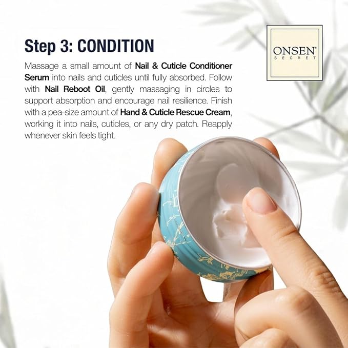 Onsen Secret Advance Rescue Nail Kit - Strengthening Nail Oil & Serum with Hand & Cuticle Rescue Cream - Tsubaki, Shea Butter, Jojoba - Hydrates, Repairs, and Restores