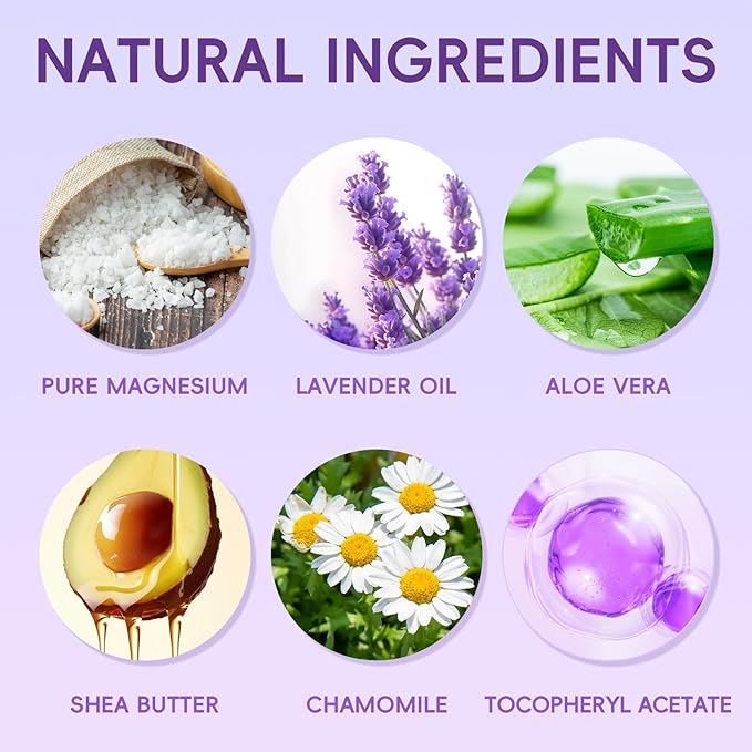 - 【Versatile Use】This soothing lavender magnesium lotion can be applied to the legs, arms, chest, or feet. Ideal for multiple moments—whether after work, post-workout, or as part of a calming bedtime routine—it also perfect gift for women and man.