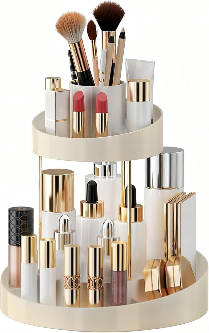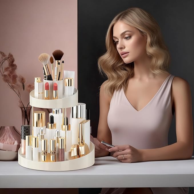 - [Multi-functional Design] The 360 Rotating Makeup Organizer makes accessing cosmetics easier, delivering a convenient user experience. The protective edge design of the tray can effectively prevent cosmetics from slipping off. The 2 tier Makeup Organizer Countertop features different divided compartments inside, which perfectly store various items such as skin care products, makeup brushes, and perfumes