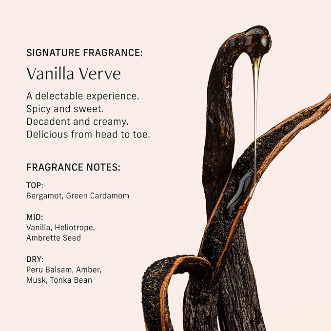 - VANILLA VERVE SCENT: Vanilla, bergamot, amber, and Peru balsam create a harmonious balance of creamy sweetness, citrus brightness, and warmth. We developed Vanilla Verve for a delicious all-day scent that's spicy, sweet, and creamy.