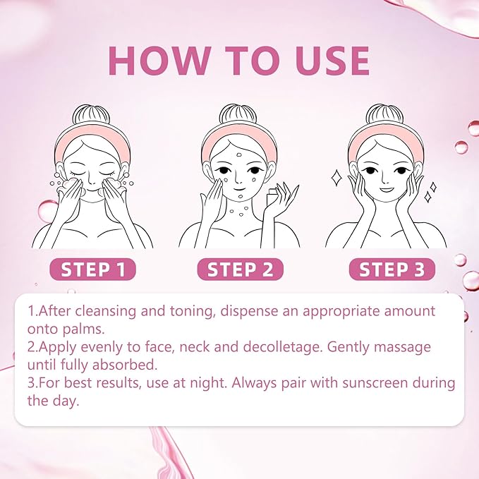 - Easy Nighttime Routine:For optimal results, apply to clean skin each night. Gently massage until fully absorbed. Always follow with sunscreen during the day to protect your skin.