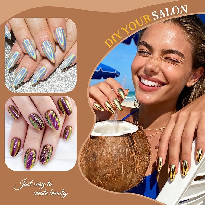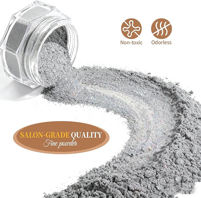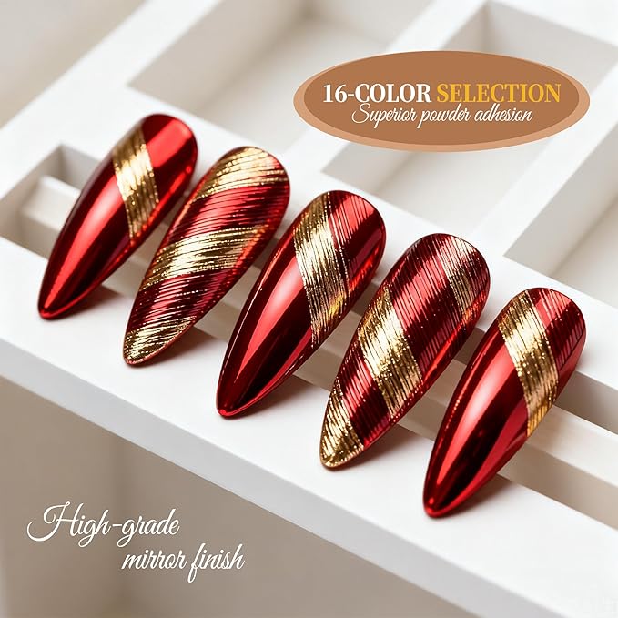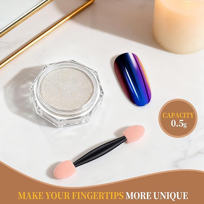 - 【PACKAGE CONTENTS】:16 pcs(each 0.5gram) Artdone Chrome Nail Powder, 6 for white based pearl nail pigment powders, 4 for Aurora chrome nail powder, 5 for mirror chrome powder, and 1 sliver holographic nail powder. They needs to be used with gel nail polish and no wipe top coat.