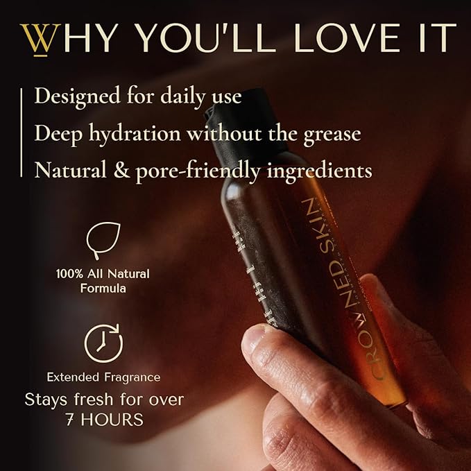 - New Daily Moisturizer for Men: The new formulas for Crowned Skin King body butter and oil colognes are designed for daily use and work instantly to nourish and hydrate your skin. These premium, naturally fragranced, nourishing, and hydrating skin care products provide excellent skincare while boosting your confidence, helping you to feel more attractive.