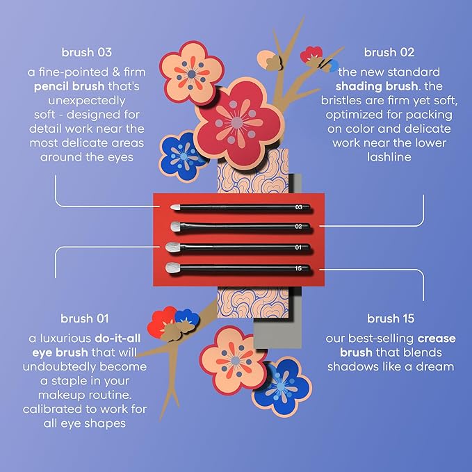 - 4 Essential Eye Brushes – Includes Brush 01 (all-purpose), Brush 02 (shading), Brush 03 (detail/pencil), and Brush 15 (crease), covering every step of eye makeup.
