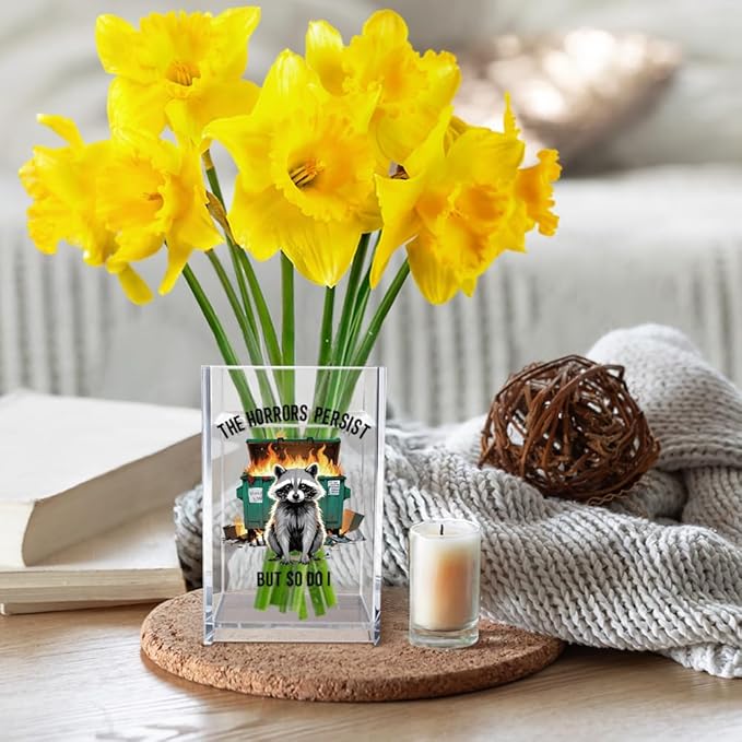 The Horrors Persist But So Do I Acrylic Cosmetic Pencil Pen Holder Cup, Emotional Dumpster Fire Pencil Pen Holder Cup, Raccoon Lover Gifts for Women Men, Mental Health Gifts for Women Colleague
