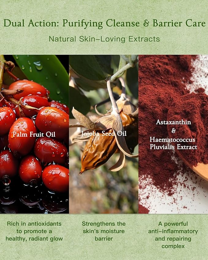 - Safe Ingredients :Infused with 12 natural skin-nurturing extracts, including Palm Fruit Oil, Jojoba Seed Oil, and Astaxanthin & Haematococcus Pluvialis Extract, this cleansing balm gently removes makeup while protecting and strengthening the skin’s natural barrier.