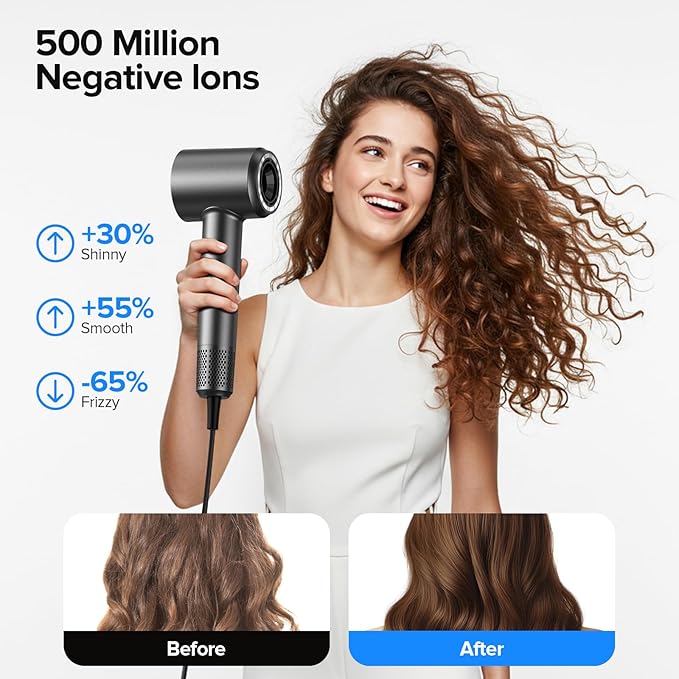 Hair Dryer, 150000 RPM Brushless Motor with 500M Negative Ions, Fast-Dry Lightweight Design, ThermoControl & Magnetic Nozzle/Diffuser, Low Noise Salon Blow Dryer for All Hair, Travel, Home