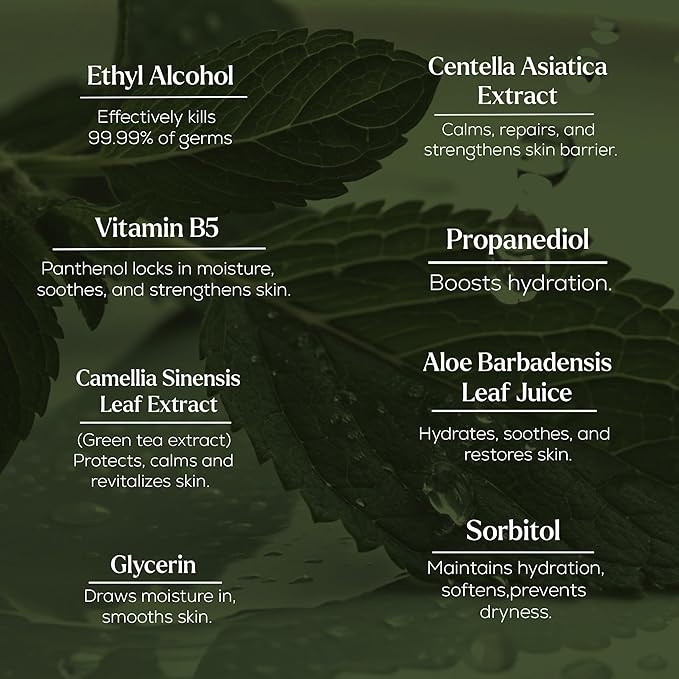 - CALMING K-BEAUTY HYDRATION: gemi Hand Sanitizer + Serum fuses advanced K-beauty skincare with germ protection, enriched with Centella Asiatica, Vitamin B5, and Green Tea. Leaves hands luxuriously soft, silky, nourished, and hydrated after every use.
