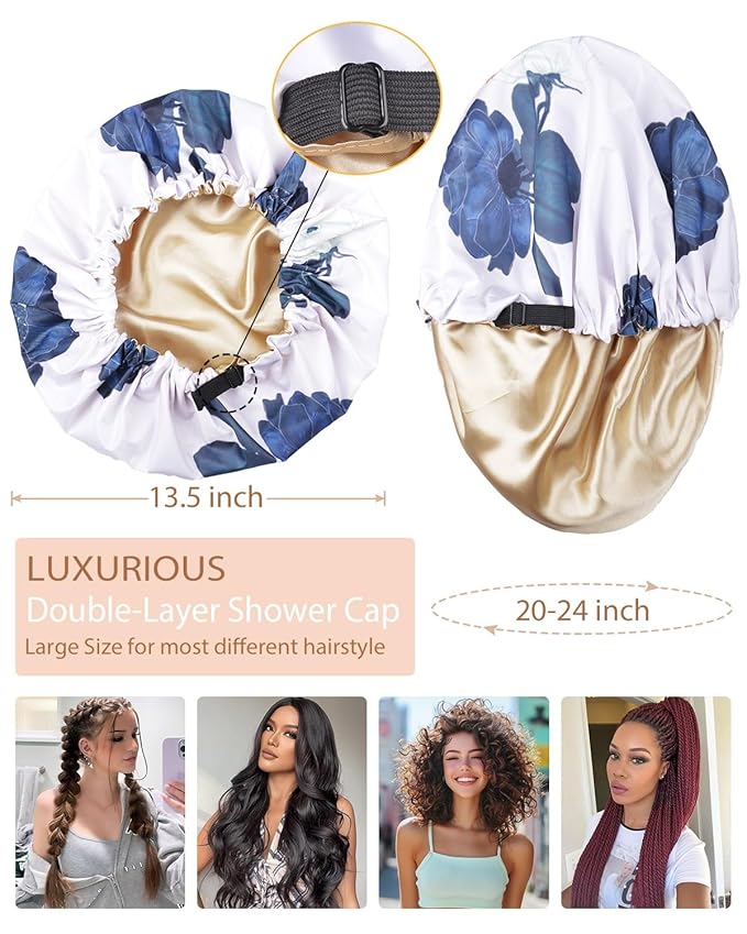 Shower Caps for Women Waterproof Reusable… (Blue Flower)