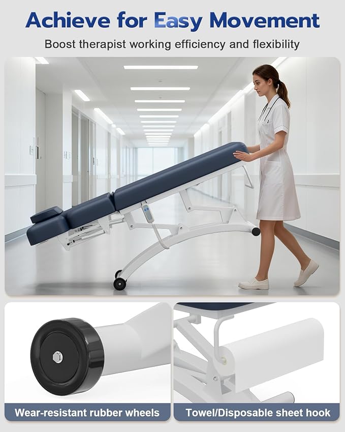 - 【Stability and Durability】Seamless fixed surface, heavy duty steel frame, reinforced corners and anti-slip foot pads, better in performance than an ordinary exam bed. Engineered for stability under pressure and resistant to deformation for professional therapists, load up to 250kg/550lbs. Designed with 2 smooth-rolling rubber wheels for simple movement