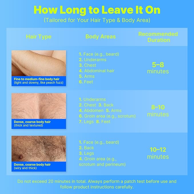 - DESIGNED FOR INTIMATE USE: This hair removal cream is specially formulated for men's private and intimate areas, providing a gentle yet effective solution to keep sensitive skin smooth and hair-free. For optimal results with coarse hair, we recommend a patch test to personalize your application time (8-20 minutes).