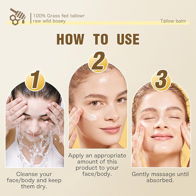 - 【Versatile Usage】This multi-purpose beef tallow for face is perfect as a night cream, lip balm, or a daily moisturizer for face, body, lips, hands, and feet. And grass fed beef tallow is also suitable as the body lotion after shower, nourishing your skin from head to toe.