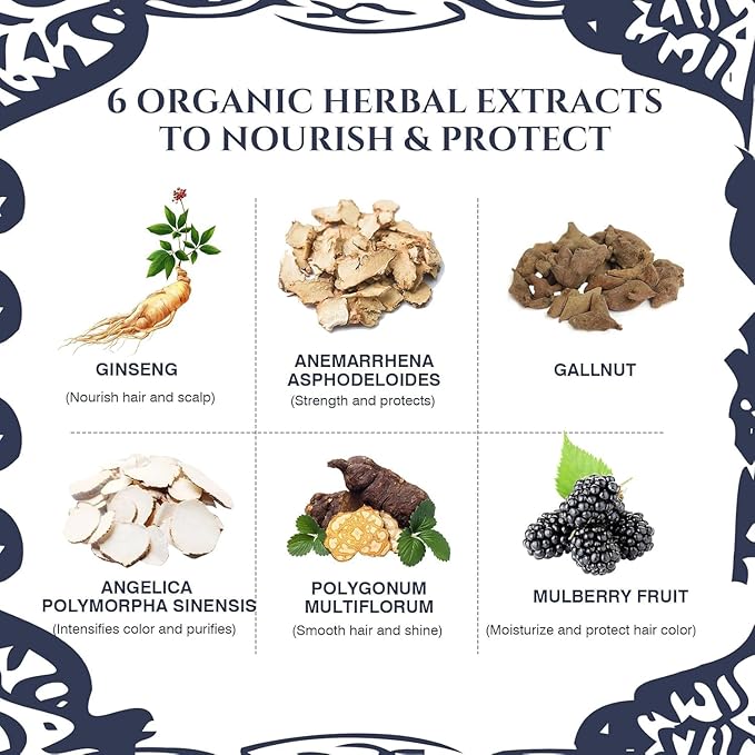 - Herbal Formula: This black hair dye is ammonia free, PPD free, hydrogen peroxide free, no harsh chemicals touch your precious locks. Color your hair and shine your hair at same time.